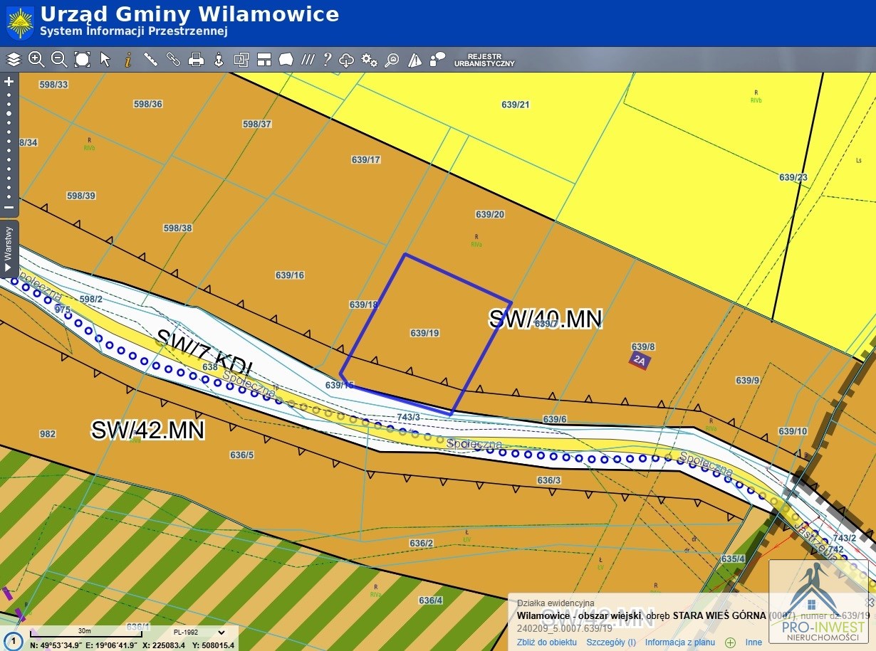 Działka na sprzedaż nr 639/19 znajduje się w m. Stara Wieś, gmina Wilamowice, przy ul. Społecznej.