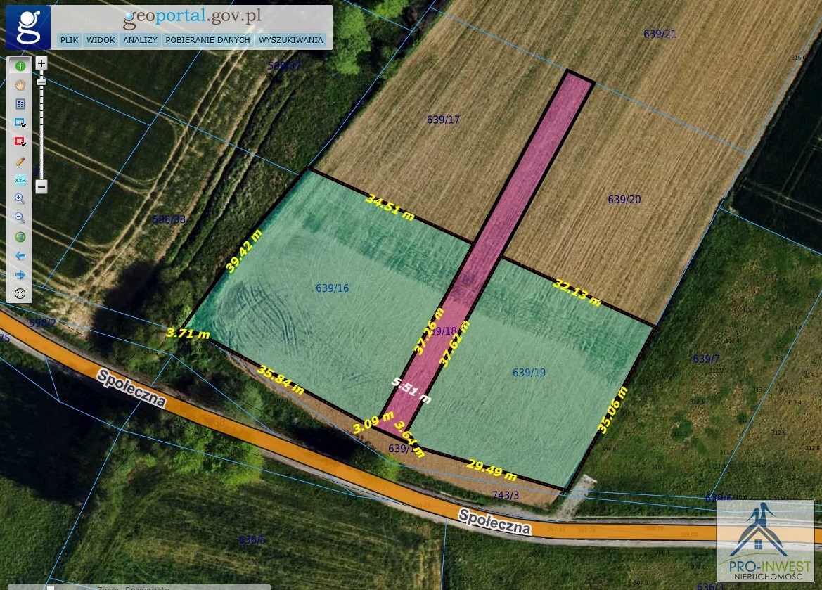 Link do geoportalu krajowego, gdzie zaznaczono działki z wymiarami oraz drogę dojazdową: https://mapy.geoportal.gov.pl/imap/Imgp_2.html?locale=pl&gui=new&sessionID=BCE01B73-295C-4392-B833-327DAF85C138