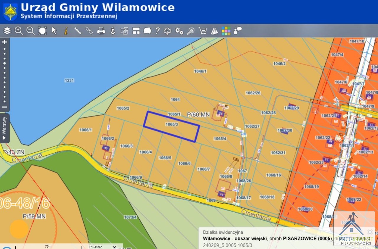 Informacja z miejscowego planu zagospodarowania przestrzennego dla działki 1065/3 z obrębu PISARZOWICE (Informacje z systemu wilamowice.e-mapa.net firmy Geo-System sp. z o.o.)