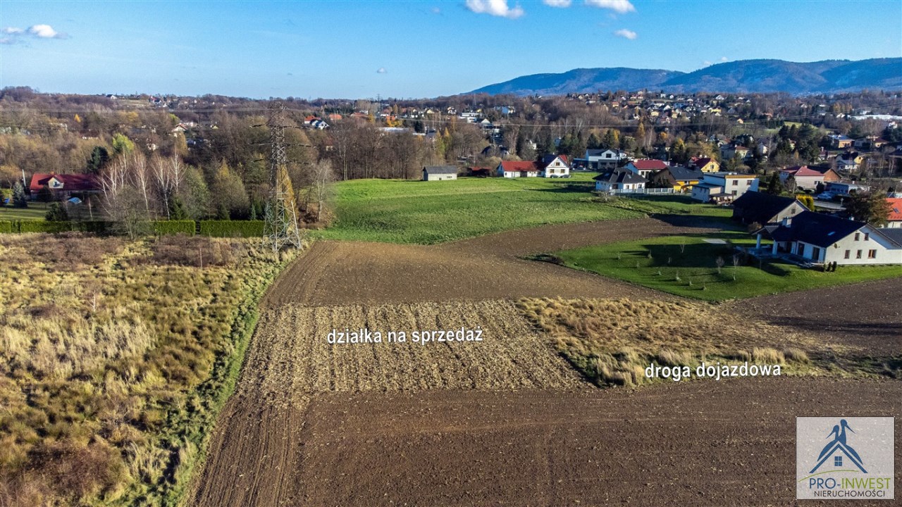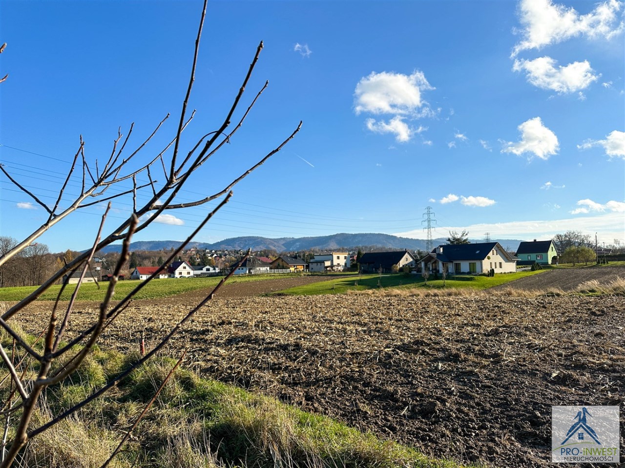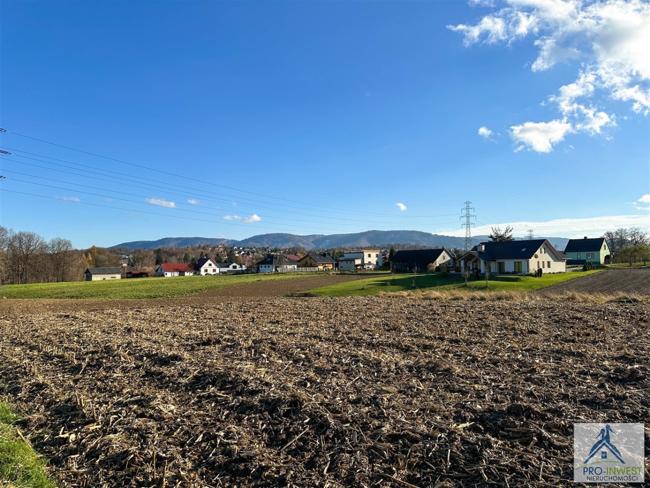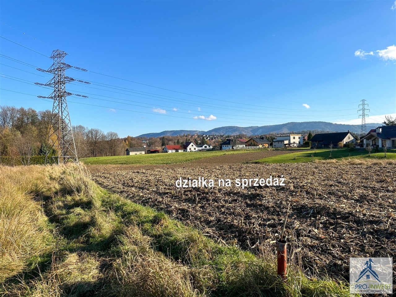 Prawie 10 arów terenu budowlanego dla domu jednorodzinnego, z doskonałym dojazdem, z górami na horyzoncie, blisko przystanku i z dostępem do mediów.