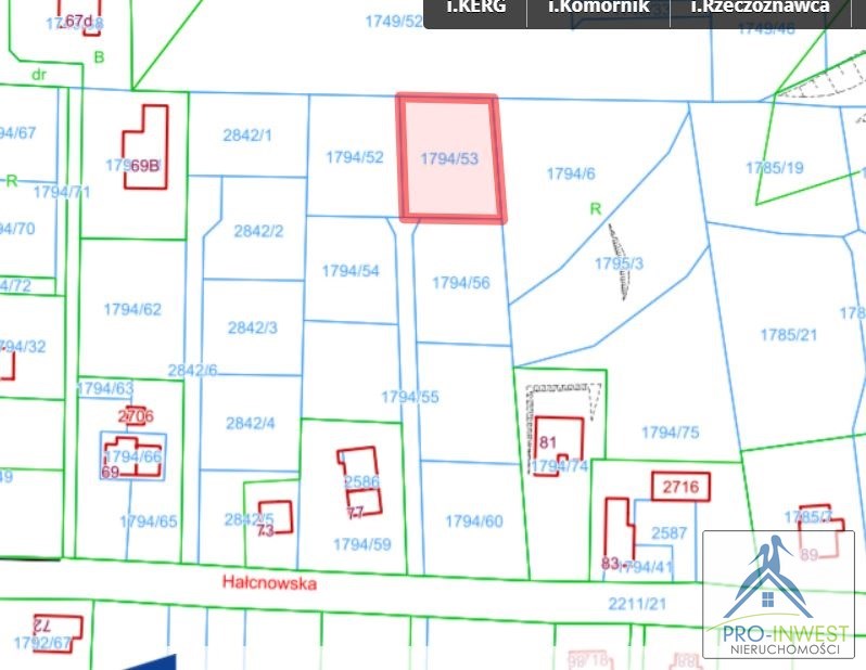 Działka na sprzedaż ma nr 1794/53, znajduje się w m. Bielsko-Biała, Komorowice Krakowskie ul. Hałcnowska.