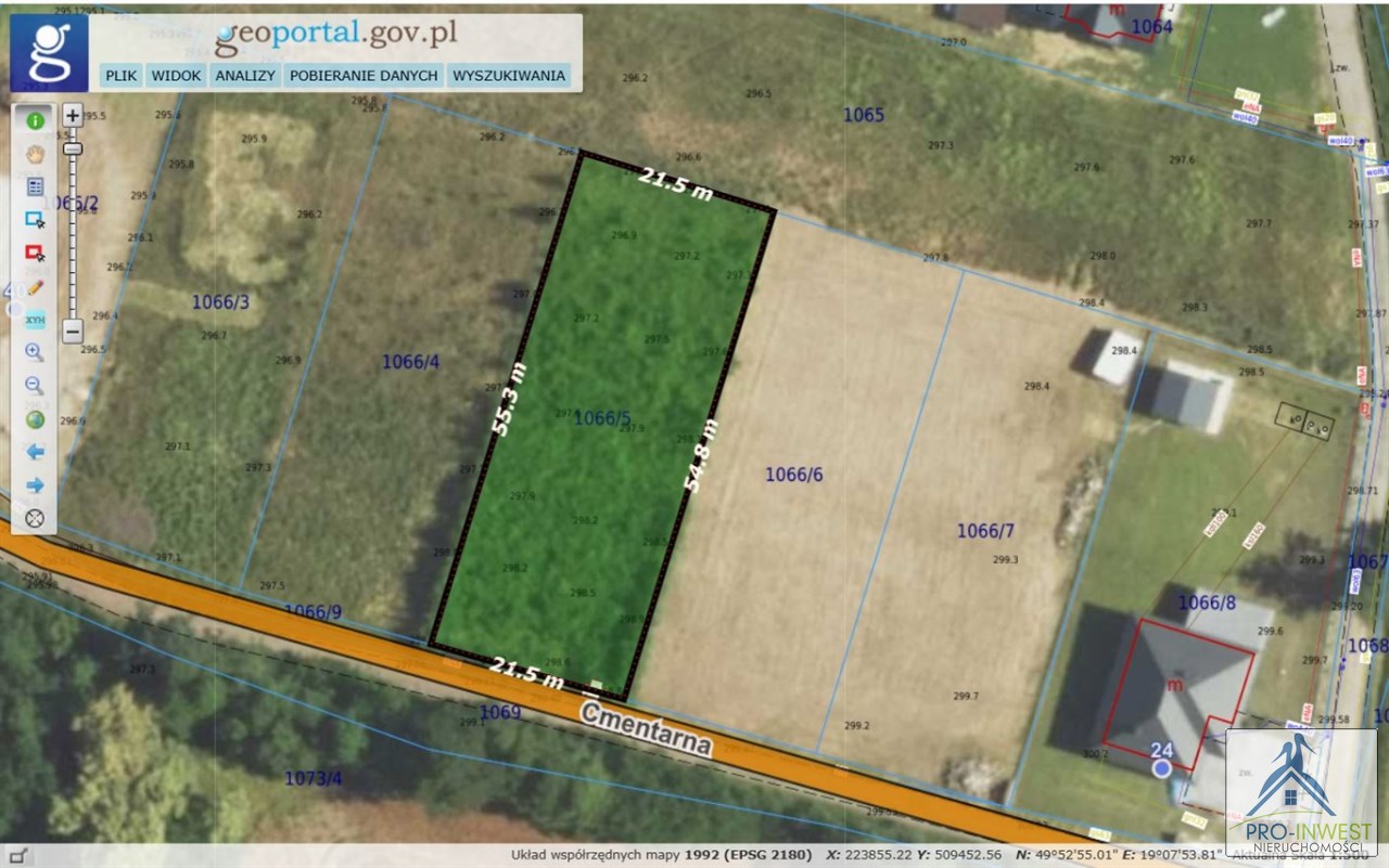 Działka nr 1066/5 znajduje się w m. Pisarzowice, przy ul. Cmentarnej.